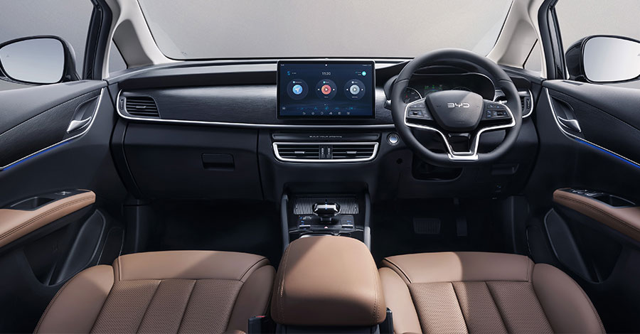 BYD M6 interior combines the main instrument trim with the technical texture of the door guards, elevating the vehicle interior to new heights of sophistication.
